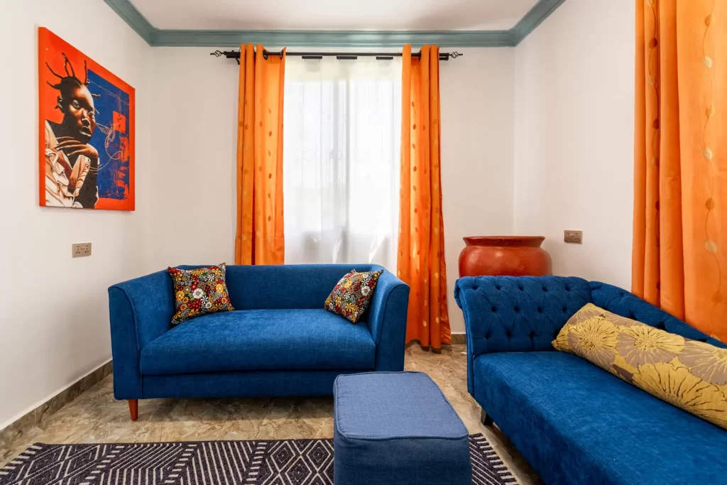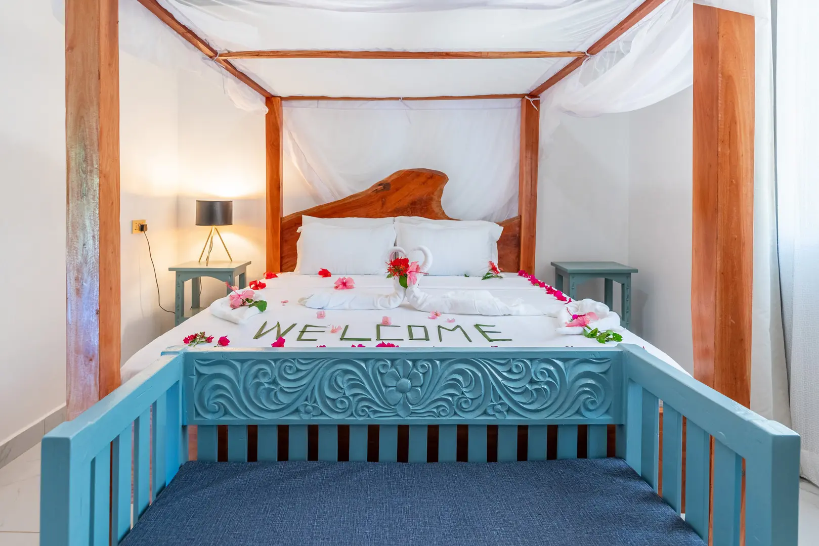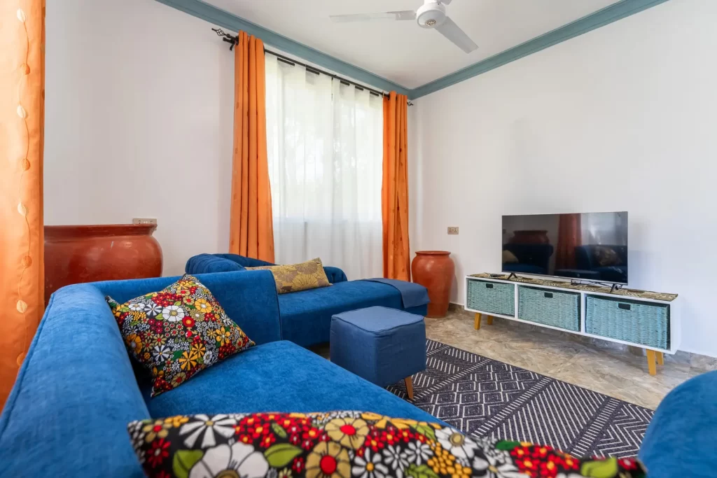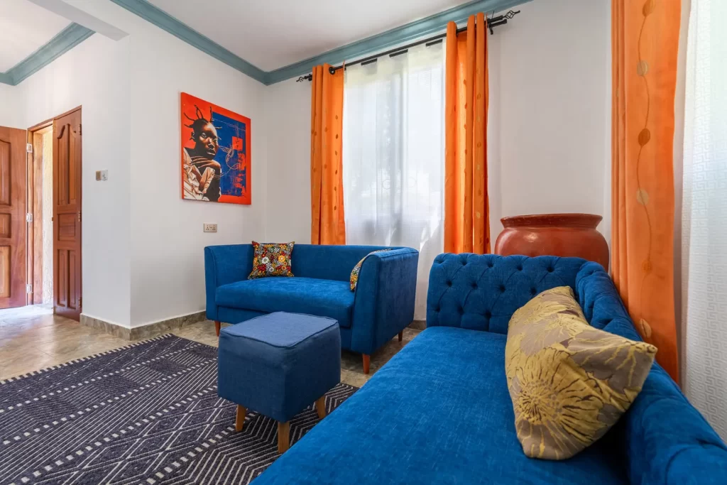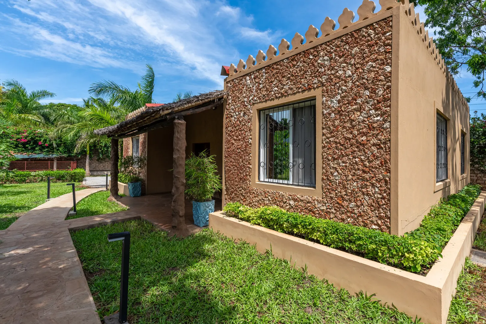 Babylon Gardens is a newly built resort in the heart of Diani Beach, Kenya. Eight spacious one bedroom villas spread out on a 4,000 sqm compound. Each villa has a porch, a sitting room with two sofas, large 43″ smart TV, a tea kitchen (kettle and fridge/freezer) and dining for two. The bedroom has a king size bed with high quality mattress, open wardrobes and air conditioner. The barrier-free bathroom has a walk-in shower. Babylon Gardens is suitable for singles and couples but not for kids under 12.