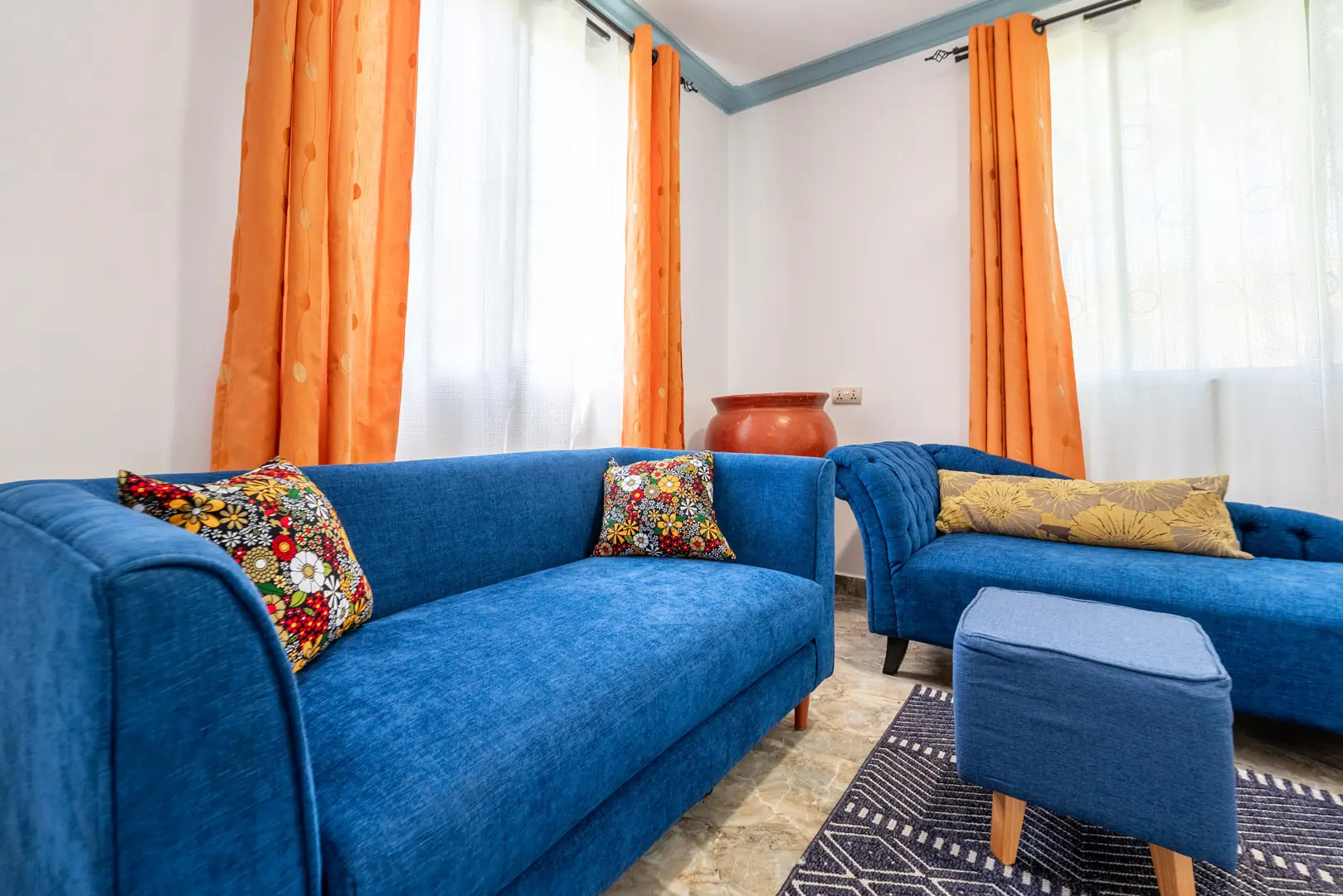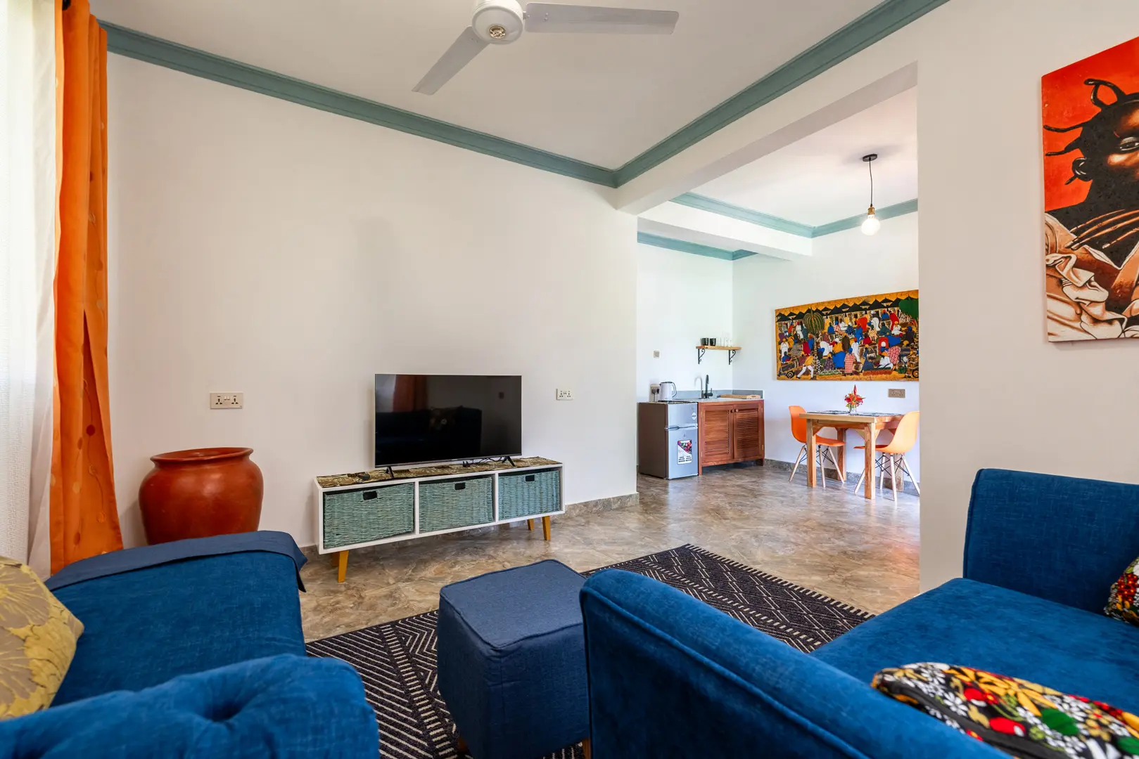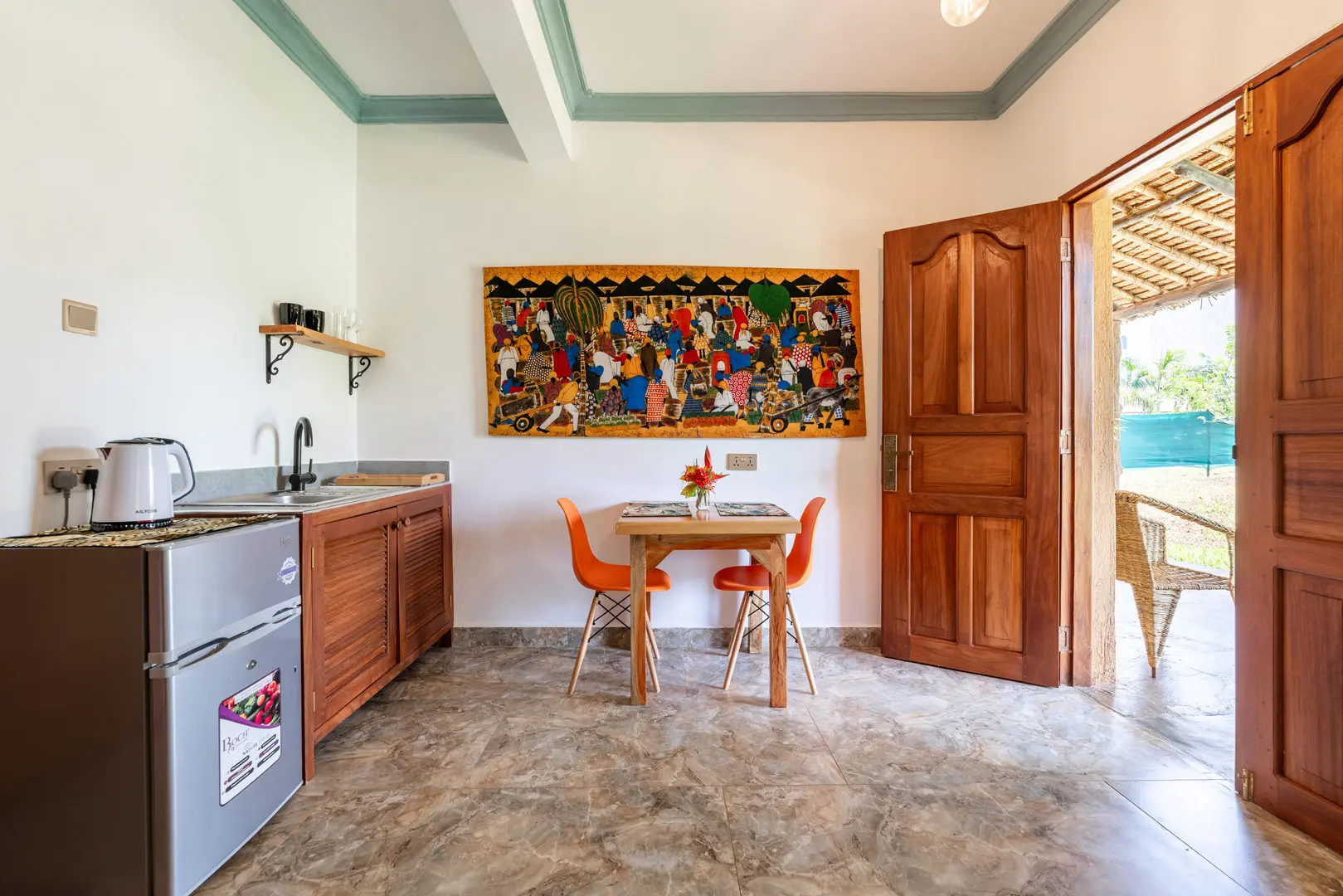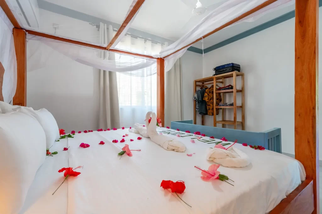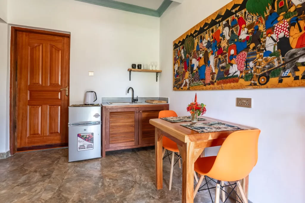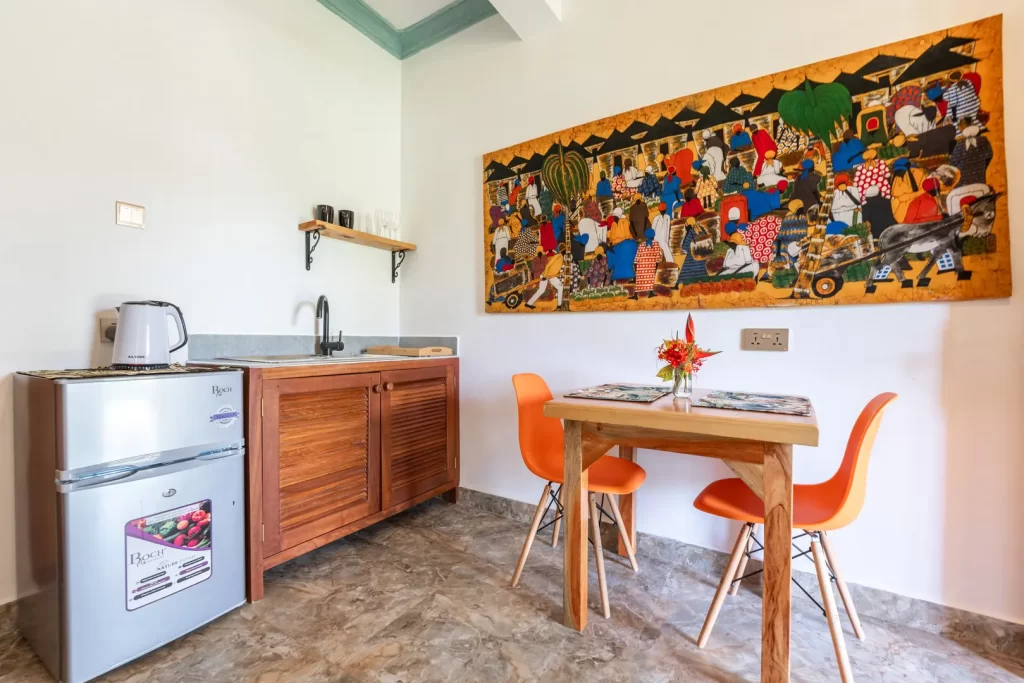 Babylon Gardens is a newly built resort in the heart of Diani. Eight 1 BR villas spread out on a 4,000 sqm compound. Each villa has a porch with seats and benches, the sitting room has a tea kitchen (kettle and fridge/freezer), dining for 2, large 43" smart TV. The bedrooms has a king size bed with high quality mattress, open wardrobes and AC. The spacious bathroom has a walk-in shower.